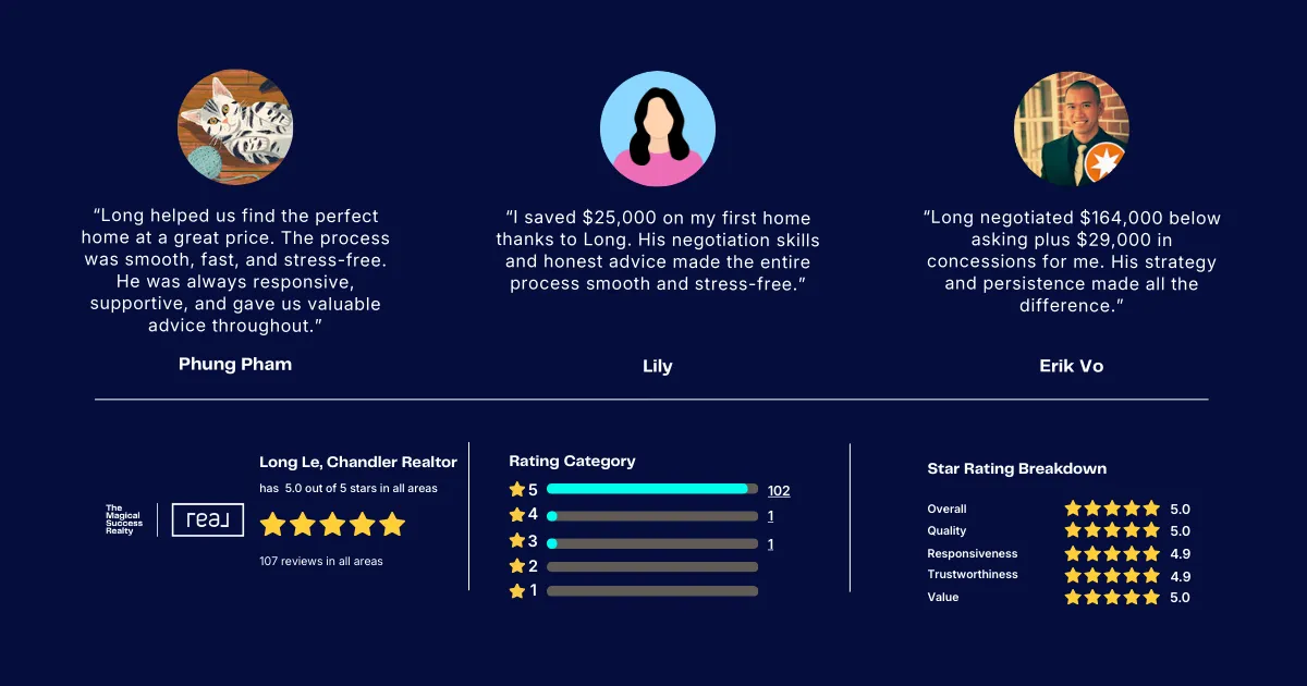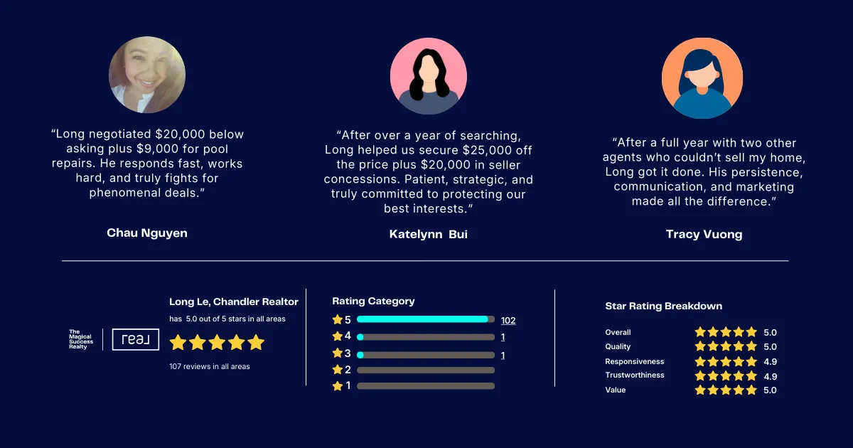 Magical Success Realty is a real estate team led by Long Le, serving home buyers and sellers in Chandler, Phoenix and surrounding Arizona markets. We focus on buyer representation, seller listing strategy, and data-driven real estate decisions. Long leverages his professional engineering background and advanced market analysis to craft winning negotiation strategies.